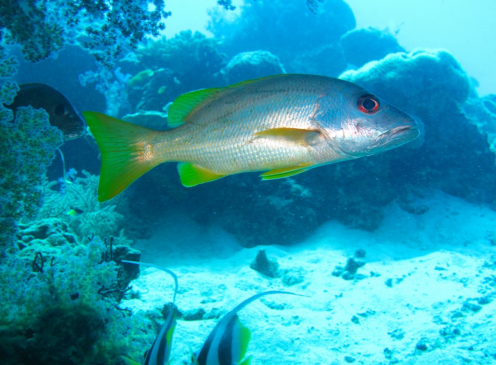 体側に金色のラインが入り、群れで中層を泳ぐ姿が美しいスナッパー。ピピ島やラチャノイ島周辺の岩礁域で観察され、太陽光に反射すると黄金色に輝きます。