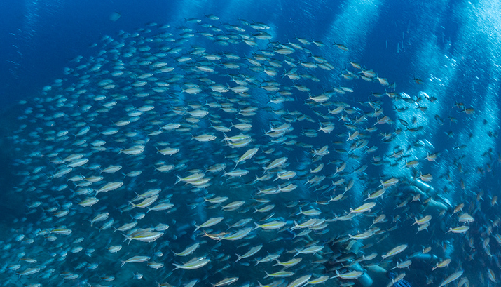 色とりどりのソフトコーラルに、無数の魚群が重なる光景は、まさに圧巻です。